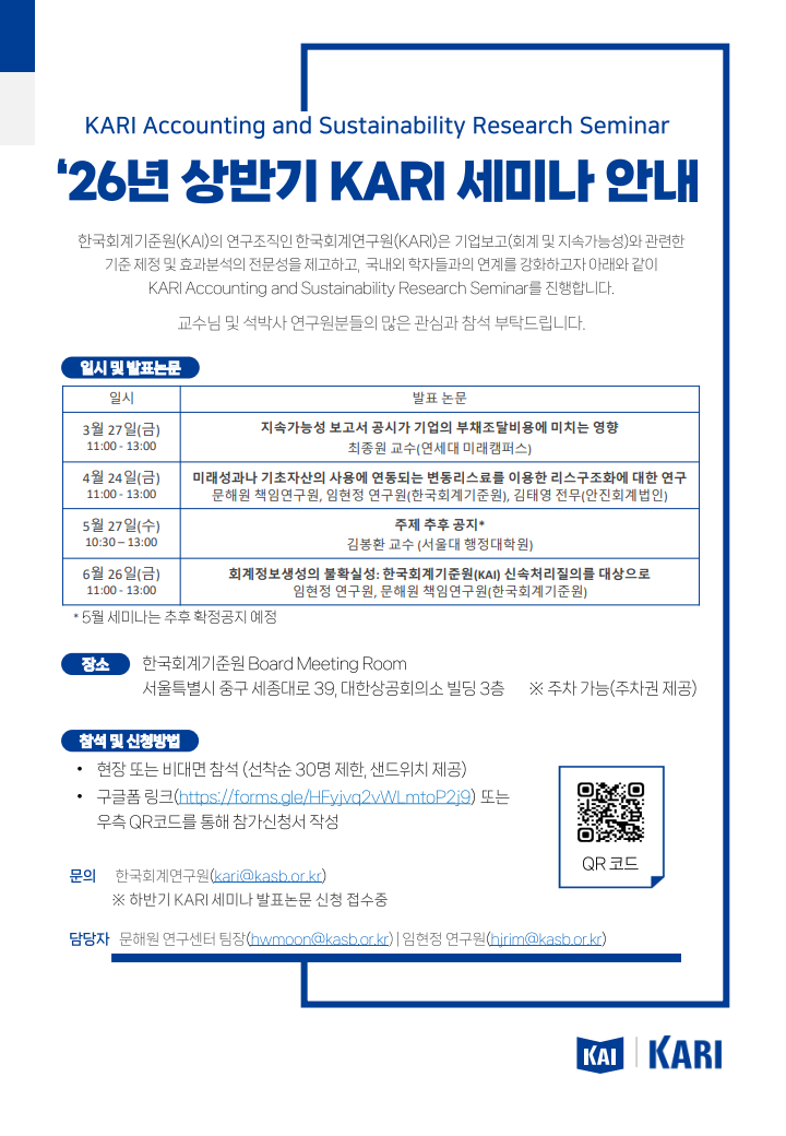 - [공지] 한국회계기준원 2026년 상반기 KARI Accounting and Sustainability Research Seminar